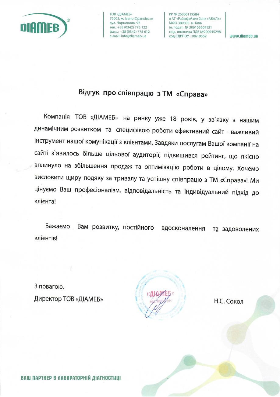 Компанія ТОВ "Діамеб" на ринку уже 18 років, у зв'язку з нашим динамічним розвитком та специфікою роботи ефективний сайт - важливий інструмент нашої комунікації з клієнтами. Завдяки послугам Вашої компанії на сайті з'явилось більше більше цільової аудиторії, підвищився рейтинг, що якісно вплинуло на збільшення продаж та оптимізацію роботи в цілому. Хочемо висловити щиру подяку за тривалу та успішну співпрацю з ТМ "Справа"! Ми цінуємо Ваш професіоналізм, відповідальність та індивідуальний підхід до клієнта!