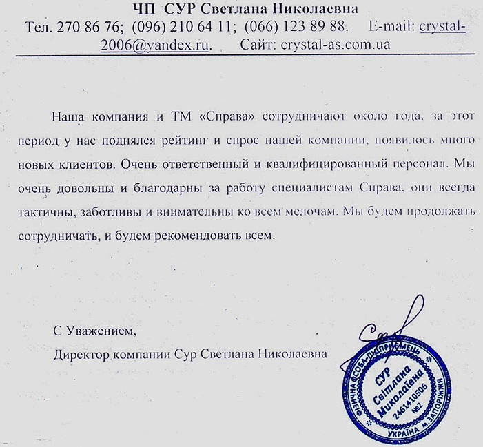 Наша компанія та ТМ «Справа» співпрацюють близько року. За цей період піднявся рейтинг нашої компанії та попит на її послуги, з'явилося багато нових клієнтів. Дуже відповідальний та кваліфікований персонал. Ми дуже задоволені та вдячні за роботу фахівцям «Справа», які завжди тактовні, дбайливі та уважні до всіх дрібниць. Ми продовжуватимемо співпрацю та рекомендуватимемо всім.