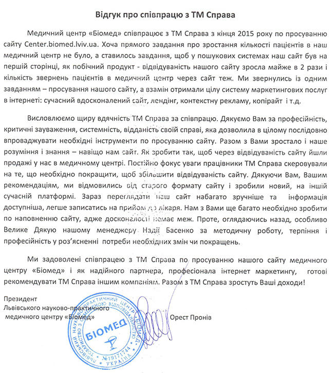 Мы удовлетворены сотрудничеством с ТМ Справа по продвижению сайта медицинского центра «Биомед» и как надежного партнера и профессионала в интернет-маркетинге готовы рекомендовать ТМ Справа другим компаниям. Вместе с ТМ Справа вырастут и ваши доходы!