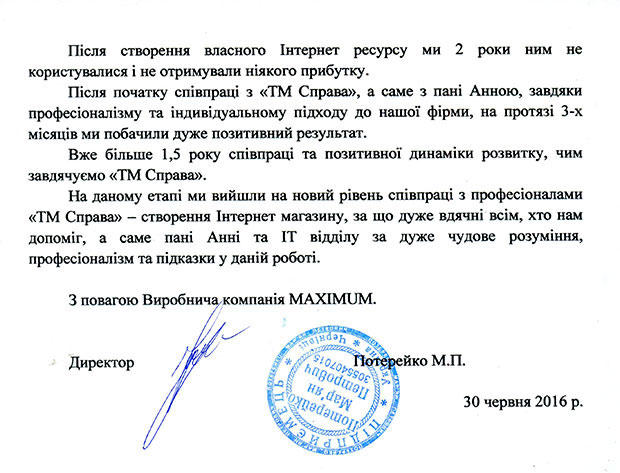 Після початку співпраці з «ТМ Справа», а саме з пані Анною, завдяки професіоналізму та індивідуальному підходу до нашої фірми, на протязі 3-х місяців ми побачили дуже позитивний результат.
