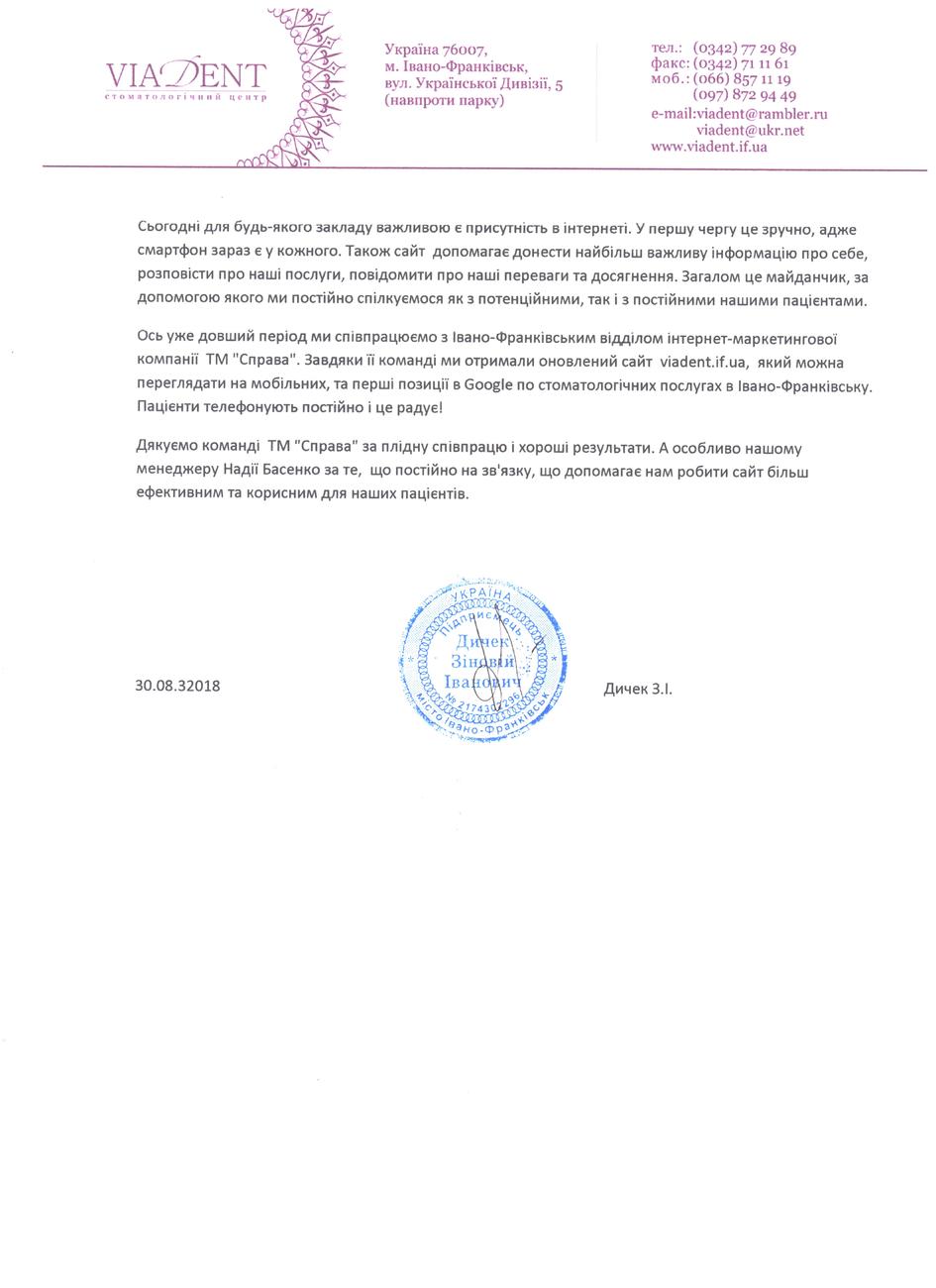 Мы уже длительное время сотрудничаем с Ивано-Франковским отделом интернет-маркетинговой компании ТМ "Справа". Благодаря их команде мы получили обновленный сайт, который удобно просматривать с мобильных устройств, а также достигли первых позиций в Google по стоматологическим услугам в Ивано-Франковске. Пациенты постоянно звонят, и это радует!